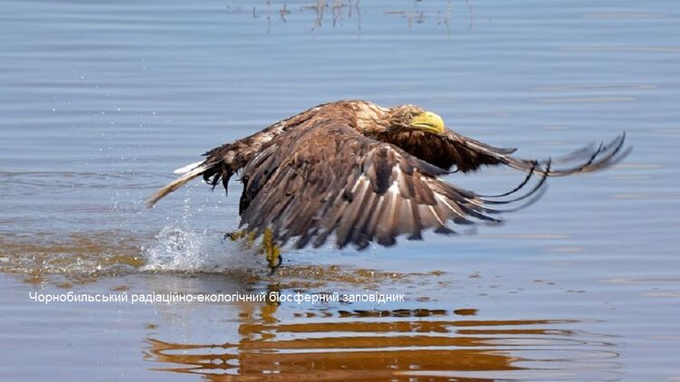 Чернобыльский радиационно-экологический биосферный заповедник опубликовал фото орлана-белохвоста, летящего низко над поверхностью воды. Видимо, за несколько секунд до этого он пикировал вниз за рыбой. Но судя по пустым лапам, бросок выдался неудачным.