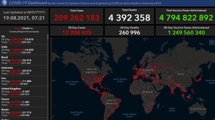 По последним данным университета Дж. Хопкинса (следит за ситуацией в разных странах в режиме мониторинга 24/7), на утро 19 августа отмечено уже 209 262 183 зараженных с момента начала пандемии, число жертв - 4 392 358.