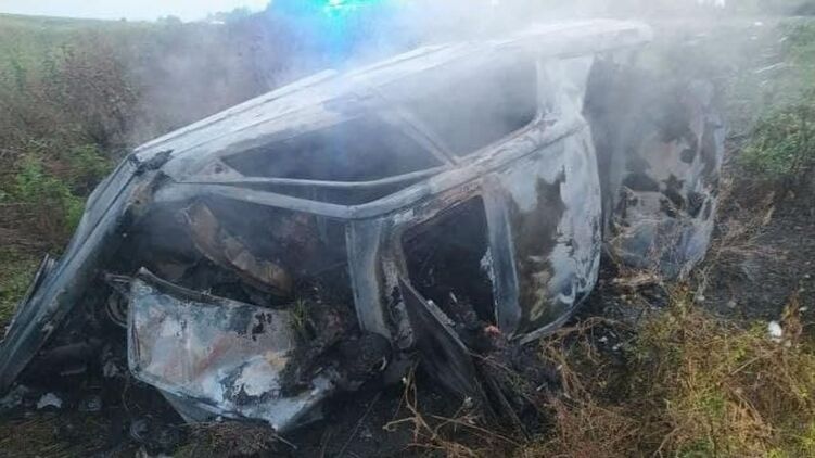 После столкновения Mercedes перевернулся, вылетел в кювет и загорелся. Водитель и четверо пассажиров погибли на месте. На фото видно, что автомобиль полностью выгорел. Не исключено, что находившаяся в нем семья с тремя детьми ехала на море.