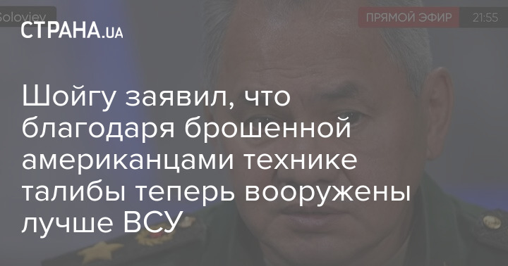 Министр обороны России Сергей Шойгу заявил, что движение "Талибан" благодаря брошенному американскими военными оружию сейчас вооружено лучше, чем армия Украины.