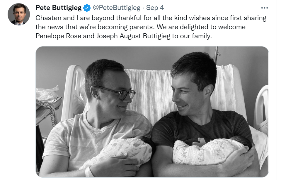 Министр транспорта США Питер Буттиджич, который является открытым геем, вместе со своим партнером Чэстеном приняли в семью двух новорожденных детей.