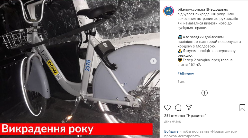 "Недавно произошло похищение года. Наш велосипед попал в руки воров которые пытались вывезти его в соседнюю страну. Но благодаря доблестным полицейским наш герой вернулся с границы с Молдовой. Спасибо полиции за оперативную реакцию", - говорится в сообщении.