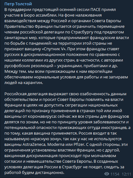 Кроме того Толстой добавил, что "российская делегация выражает свою озабоченность данным обстоятельством и просит Совет Европы повлиять на власти Франции в целях не допустить сегрегации национальных делегаций по признаку применения в странах той или иной вакцины от коронавируса".