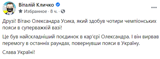 Первым украинского боксера поздравил мэр Киева Виталий Кличко, который присутствовал на поединке и сразу после него обнялся с Усиком. А потом опубликовал и пост в соцсетях.