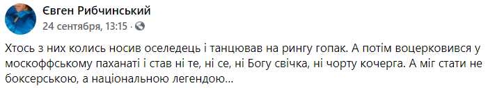 Экс-нардеп Евгений Рыбчинский прошел интересные метаморфозы. Накануне боя он написал пост, где обвинил Усика за воцерковление "в московском паханате". И заявил, что теперь он "ни Богу свечка, ни черту кочерга".