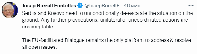 Верховный представитель ЕС Жозеп Боррель заявил, что стороны конфликта Северного Косова - Белград и Приштина - должны немедленно разрядить обстановку в регионе, вывести оттуда силы спецназначения и ликвидировать блокпосты.