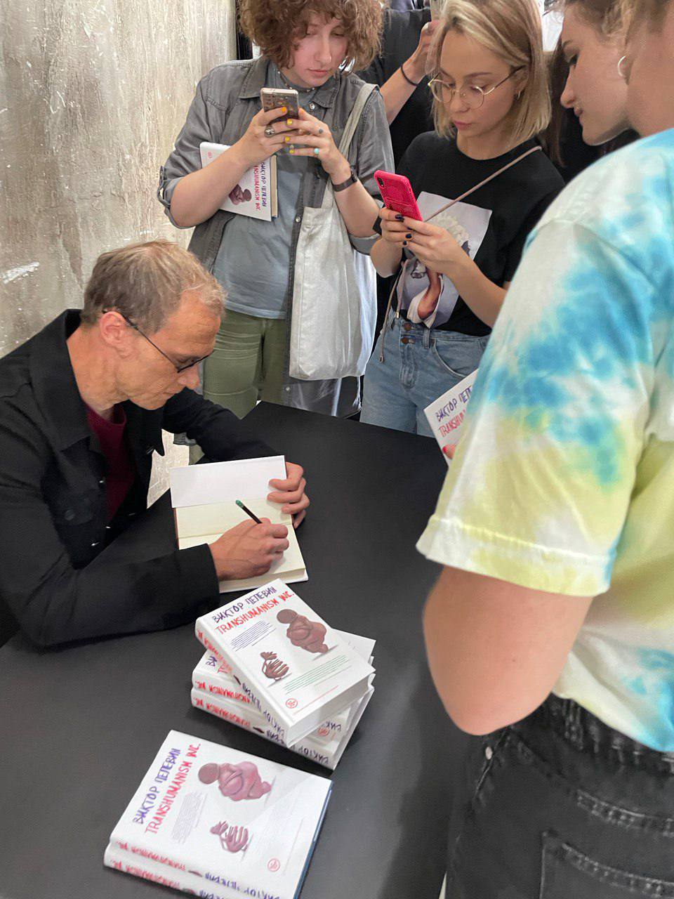 Читатели радо позировали на фоне "двойника" Пелевина, делали фотографии того, как он подписывает экземпляры восемнадцатого романа писателя под названием Transhumanism Inc.