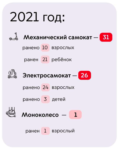 В 2021 году в Москве участились аварии с участием упомянутых средств передвижения. Статистика с начала года по конец июня выглядит так. Были зафиксированы и летальные случаи - после столкновения с самокатом в Москве погиб известный физиолог, правнук поэта Тютчева.