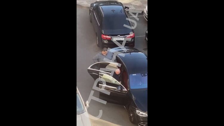 На кадрах видно, как в Новопечерских Липках в столице Юзик (в серой рубашке) погружается в машину Mercedes-Benz S-Class 500.