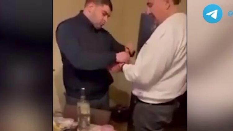 Правоохранители защелкивают наручники на запястьях экс-президента Грузии на фоне стола с бутылками спиртного и остатками закуски. После того, как на Саакашвили надели наручники, он продолжает что-то допивать из стакана.