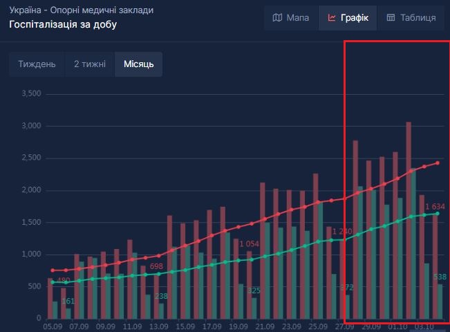 В Украине продолжается рост госпитализаций ковид-больных. Мы проанализировали этот показатель, а также данные по заполненности больничного фонда за последние семь дней с 28 сентября по 4 октября.