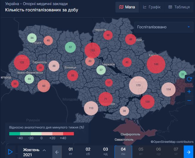 Карта госпитализаций за сутки. Данные с сайта health-security.rnbo.gov.ua