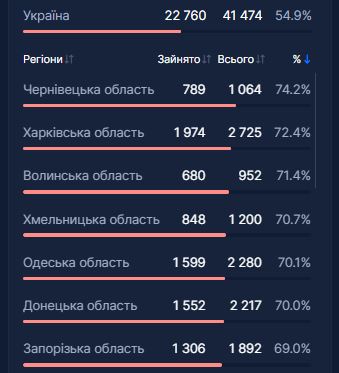 Заполненность ковид-коек. Что касается заполненности койко-фонда для больных с Covid-19, то в целом по Украине занято 54,9% мест (22 760 из 41 474). Семерка регионов, где занято больше всего таких мест в больницах выглядит так: