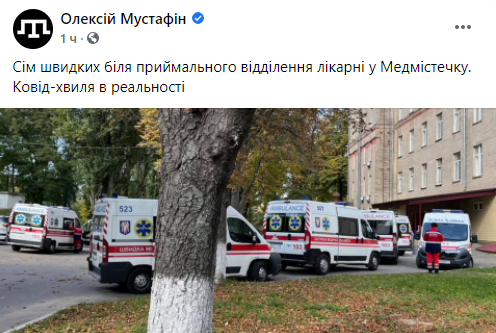 "Семь скорых около приемного отделения больницы в Медгородке. Ковид-волна в реальности", - написал журналист Алексей Мустафин, обнародовав соответствующее фото.