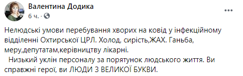 При этом украинцы пишут о неудовлетворительных условиях больничных палат. Так, например, пользовательница Facebook Валентина Додика описала, в каких условиях врачебный персонал инфекционного отделения Ахтырской ЦРБ (Сумская область) спасает от смерти больных коронавирусом: