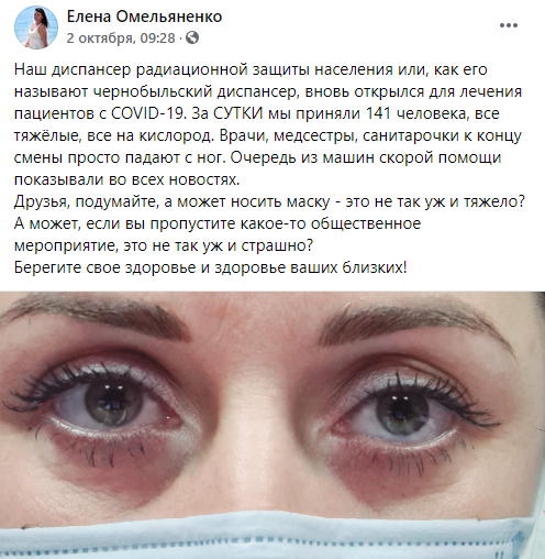 "Все тяжелые, все на кислороде. Врачи, медсестры, санитарки до конца смены просто падают с ног. Очередь из машин скорой помощи показывали во всех новостях. Друзья, подумайте, а может носить маску - это не так уж трудно? А может, если вы пропустите какое-то общественное мероприятие, это не так уж и страшно?" - написала Елена Омельяненко.