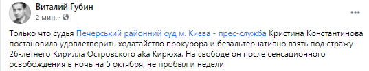 В понедельник, 11 октября, судья Печерского районного суда Киева Кристина Константинова постановила удовлетворить ходатайство прокурора и безальтернативно взять под стражу Кирилла Островского, которого выпустили из СИЗО 5 октября.