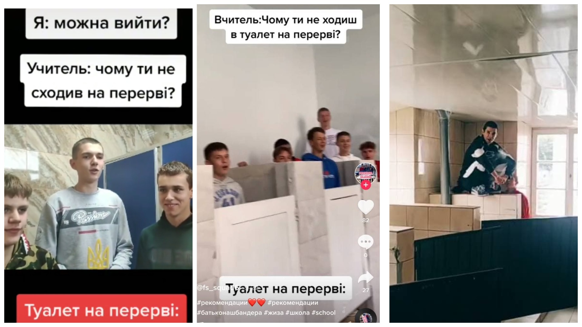 Кстати, изначально видео почему-то записывали в туалетах. Ряд роликов достаточно комично выглядят. Начинаются они с того, что человек с камерой открывает двери туалета и говорит "Слава Украине!". Тут же из кабинок появляются словно партизаны остальные, которые кричат "Героям слава" и начинают петь.