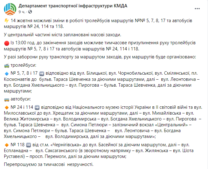 В центре Киева, 14 октября, в День защитников и защитниц Украины, запланированы массовые мероприятия. Из-за их проведения некоторые автобусы и троллейбусы временно изменят маршруты.