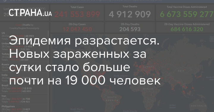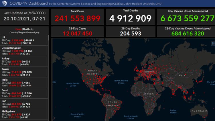 Университет Джона Хопкинса также привел новые данные на утро 20 октября. С начала пандемии на планете уже 241 553 899 человек заразились СOVID-19. Умерли за этот же срок - 4 912 909 человек.
