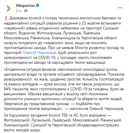 "Эпидемическая ситуация требует максимальной консолидации усилий центральной власти и органов местного самоуправления. Показатель заболеваемости, к сожалению, ежедневно растет. Количество госпитализаций и тяжелых случаев - очень высокая. 94% пациентов, которых госпитализировали с Covid-19 за неделю, были не вакцинированы. Массовая вакцинация во всем мире призвана помочь избежать критических ситуаций и сохранить жизни людей ", - написал глава Минрегиона.