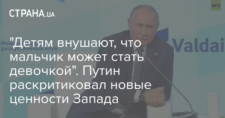 "Агрессивное вымарывание собственной истории, уход от таких понятий, как "мама", "папа", разных полов - это воспринимается на Западе как прогресс. Это чудовищно, когда детям внушают, что мальчик может стать девочкой. Идея о праве ребенка на самостоятельное определение гендера - на грани преступления против человечества", - сказал глава Кремля.