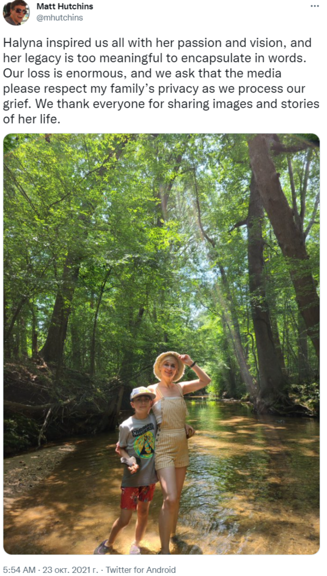"Галина вдохновила всех нас своей страстью и видением, а ее наследие слишком значимо, чтобы описать словами. Мы переживаем огромный урон, и просим СМИ уважать конфиденциальность нашей семьи в любое время невыразимого горя. Мы благодарим всех за распространение фотографий и историй из ее жизни", - написал Мэтью и опубликовал фото жены с сыном.