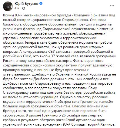 В субботу, 30 октября, тема приобрела новое дыхание. Главред "Цензора" Юрий Бутусов сообщил, что Старомарьевка находится под контролем ВСУ (поселок заняла бригада "Холодный яр"), а украинские спецслужбы уже якобы начали выявлять лиц с российским гражданством.