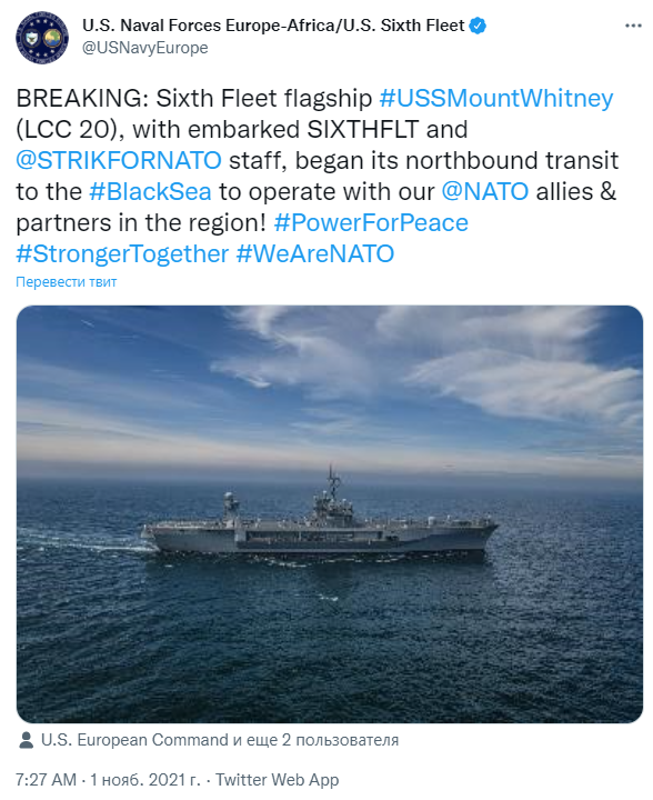 В ту же субботу Шестой флот заявил, что в Черное море выдвинется флагманский корабль Mount Whitney. А сегодня, 1 ноября, стало известно, что он только начал переход в направлении Черного моря.