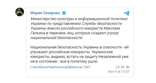 "Национальная безопасность Украины в опасности - ей угрожают российские юмористы. Украинские юмористы, видимо, встать на защиту Незалежной уже не в состоянии - все в политику ушли", - написала в телеграм-канале официальный представитель Министерства иностранных дел России Мария Захарова.