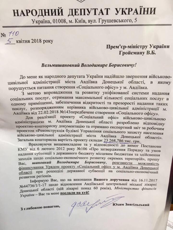"Информирую Вас, что на выполнение Вашего поручения от 16.11.2017 года относительно восстановления Авдеевской центральной городской больницы Донецкой области (этой больнице более 60 лет), Министерство финансов Украины – Вас и меня послали на х@й!" – написал главе правительства депутат.