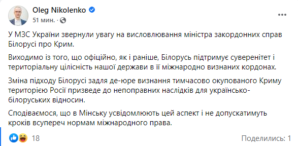 "Исходим из того, что официально по-прежнему Беларусь поддерживает суверенитет и территориальную целостность нашего государства в его международно признанных границах. Изменение подхода Беларуси для де-юре признания временно оккупированного Крыма по территории России приведет к непоправимым последствиям для украинско-белорусских отношений. Надеемся, что в Минске отдают себе отчет в этом аспекте и не будут допускать шагов вопреки нормам международного права", - написал в соцсети Николенко.