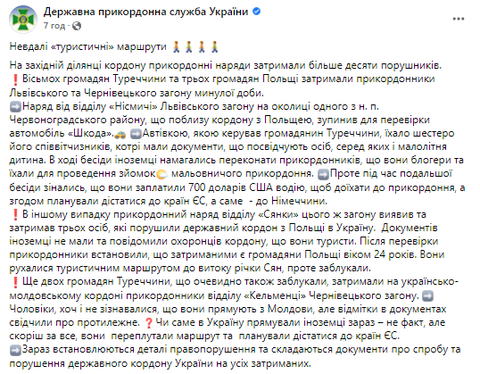 Украинские пограничники Львовского и Черновицкого отряда за прошлые сутки задержали восемь граждан из Турции и трех из Польши. Вех задержанных обвиняют в попытке и нарушении государственной границы Украины.