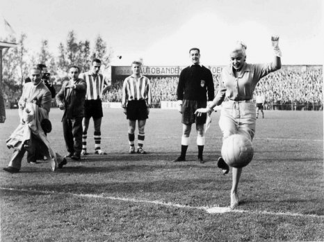 6. Актриса и звезда Playboy Джейн Мэнсфилд делает символический удар по мячу на стадионе роттердамской "Спарты". Секс-символ эпохи пришла сюда в 1957-м.