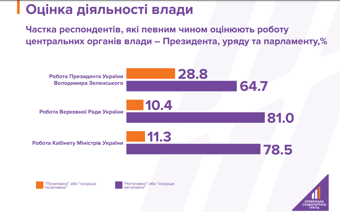 Также социологи выяснили, что 64,7% украинцев негативно оценивают работу президента Владимира Зеленского и только 28,8% отзываются о ней позитивно.