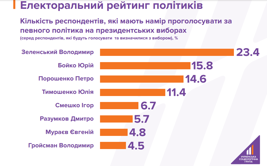 Также в топ-8 вошли Юлия Тимошенко (11,4%), Игорь Смешко (6,7%), Дмитрий Разумков (5,7%), Евгений Мураев (4,8%), Владимир Гройсман (4,5%).