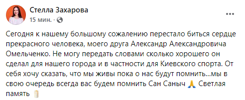 "Сегодня к нашему большому сожалению перестало биться сердце прекрасного человека, моего друга Александр Александровича Омельченко. Не могу передать словами сколько хорошего он сделал для нашего города и в частности для Киевского спорта. От себя хочу сказать, что мы живы пока о нас будут помнить…мы в свою очередь всегда вас будем помнить Сан Саныч. Светлая память", - написала олимпийская чемпионка Стелла Захарова.