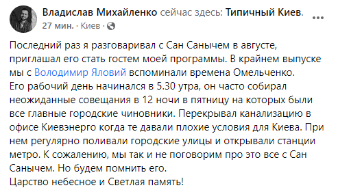 "Последний раз я разговаривал с Сан Санычем в августе, приглашал его стать гостем моей программы. В крайнем выпуске мы с Владимиром Яловым вспоминали времена Омельченко. Его рабочий день начинался в 5.30 утра, он часто собирал неожиданные совещания в 12 ночи в пятницу на которых были все главные городские чиновники. Перекрывал канализацию в офисе Киевэнерго, когда те давали плохие условия для Киева. При нем регулярно поливали городские улицы и открывали станции метро. К сожалению, мы так и не поговорим про это все с Сан Санычем. Но будем помнить его. Царство небесное и Светлая память!"