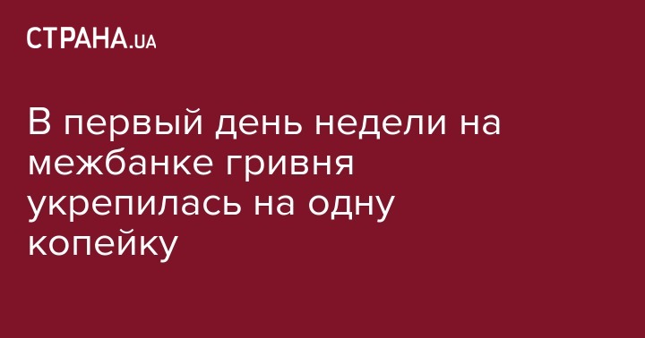 Курс гривни на межбанковском валютном рынке в понедельник укрепился до 25,70 грн/$1 с 25,795 грн/$1 в предыдущий рабочий день, сообщили агентству "Интерфакс-Украина" дилеры коммерческих банков.