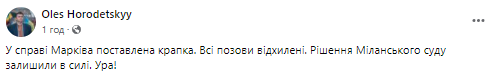 "В деле Маркива поставлена ​​точка. Все иски отклонены. Решения Миланского суда оставили в силе. Ура!" - написал он.