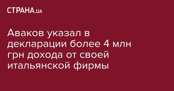 Министр внутренних дел Арсен Аваков указал в декларации 4 221 114 гривен дохода, который он получил в виде дивидендов от итальянской фирмы Avitalia S.R.L. Об этом идет речь в поданной главой МВД декларации, опубликованной на сайте Единого госреестра деклараций.