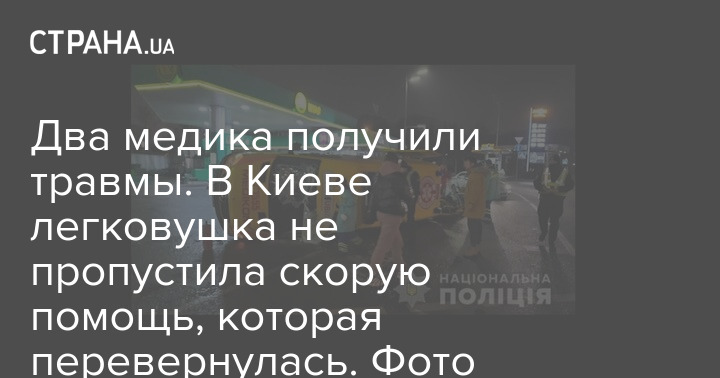 Два медика получили травмы. В Киеве легковушка не пропустила скорую помощь, которая перевернулась. Фото