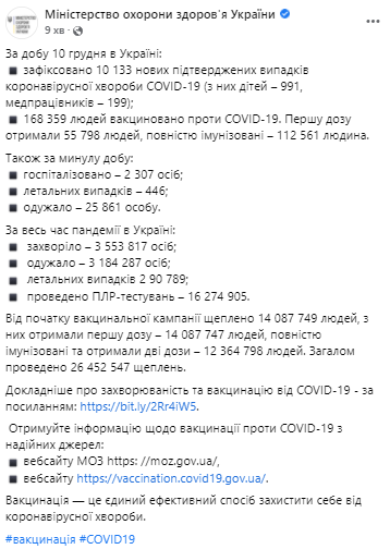 В Украине продолжается падение . В течение прошлых суток в нашей стране коронавирус выявили у 10 133 человек. (Вчера, 10 декабря, этот показатель составил 11327 случаев, позавчера, 9 декабря, - 12376 случаев).