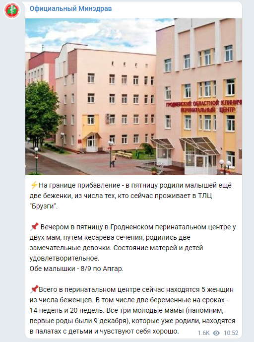 "Первое пополнение: белорусские медики приняли роды у беженки. Младенец весом в 3,5 кг чувствует себя хорошо", - сообщает пресс-служба Минздрава Беларуси о первых родах на польско-белорусской границе в четверг, 9 декабря.