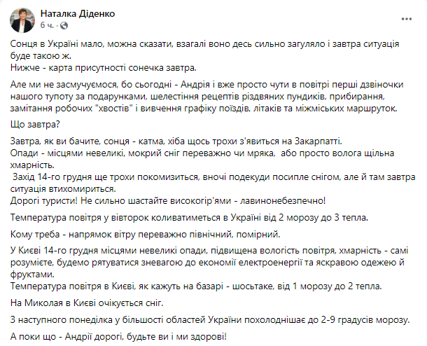 "Спасаемся яркой одеждой и фруктами". Синоптик рассказала о погоде в Украине 14 декабря