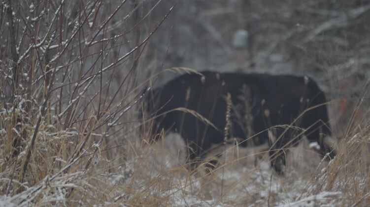 Скриншот из Фейсбука Чернобыльского заповедникаОдна из одичавших коров осеньюСтавшая дикой домашняя короваЧасть стада коровКоровы в зимнем лесу