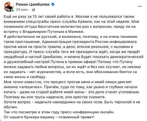 11:43 Тем временем, стало известно, что Роман Цимбалюк, несмотря на наличие аккредитации, решил не идти на пресс—конференцию. Журналист сообщил, что прогнозирует уголовного года.