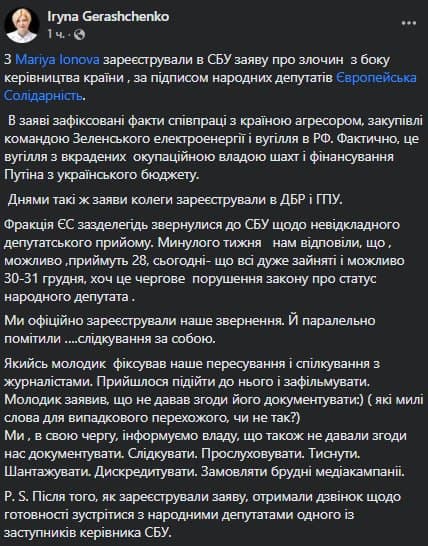 "В заявлении зафиксированы факты сотрудничества со страной агрессором, закупки командой Зеленского электроэнергии и угля в РФ. Фактически это уголь из украденных оккупационными властями шахт и финансирование Путина из украинского бюджета. На днях такие же заявления коллеги зарегистрировали в ГБР и ГПУ", - сговорится в сообщении.