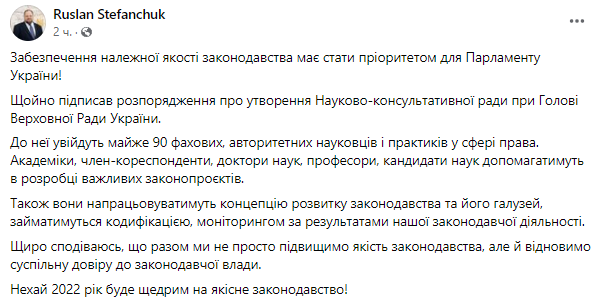 "Только что подписал распоряжение об образовании Научно-консультативного совета при председателе Верховной Рады. Искренне надеюсь, что вместе мы не просто повысим качество законодательства, но восстановим общественное доверие к законодательной власти. Пусть 2022-й будет щедрым на качественное законодательство", - говорится в сообщении.