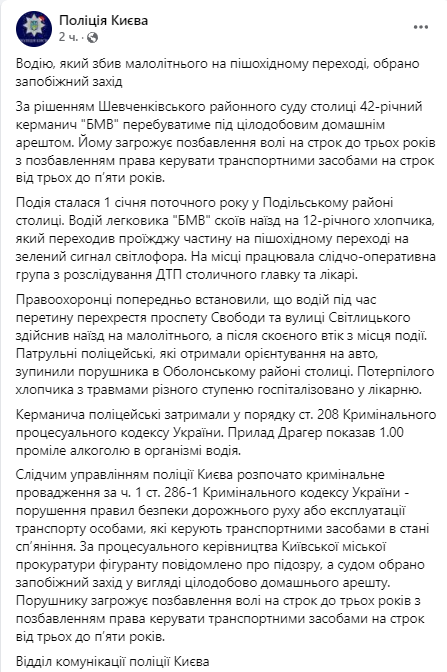Шевченковский районный суд Киева отправил под домашний арест 42-летнего водителя BMW, который в первый день января на столичном перекрестке проспекта Свободы и улицы Светлицкого сбил на пешеходном переходе 12-летнего мальчика и скрылся.